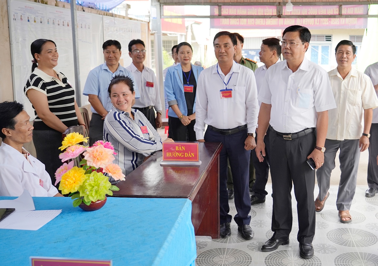Đồng chí Nguyễn Tiến Hải, Uỷ viên Trung ương Đảng, Bí thư Tỉnh ủy An Giang, kiểm tra công tác bầu cử tại khu vực bỏ phiếu số 18, xã Đông Thái. Ảnh: AGO