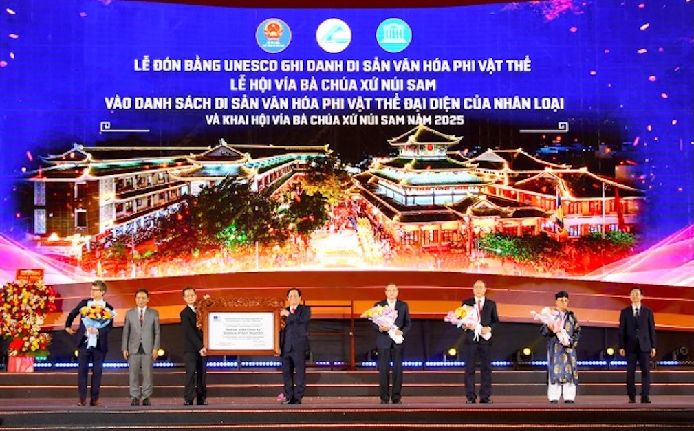 Ngày 19/3/2025, tỉnh An Giang long trọng tổ chức Lễ đón bằng UNESCO ghi danh di sản văn hóa phi vật thể Lễ hội Vía Bà Chúa Xứ Núi Sam vào danh sách Di sản văn hóa phi vật thể đại diện của nhân loại. Việc UNESCO công nhận Lễ hội Vía Bà Chúa Xứ Núi Sam là di sản văn hóa phi vật thể đại diện của nhân loại là minh chứng cho giá trị đặc sắc của di sản văn hóa truyền thống; không chỉ là niềm vinh dự lớn lao đối với tỉnh An Giang, mà còn là niềm tự hào chung của cả nước.