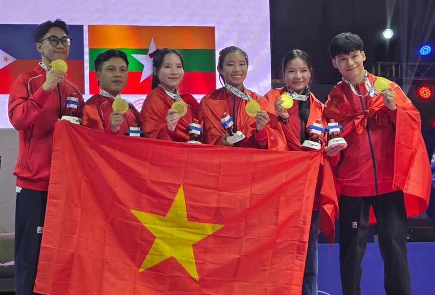Vận động viên của tỉnh An Giang cùng đồng đội đạt huy chương vàng nội dung quyền sáng tạo đồng đội, tại SEA Games 33. Ảnh: Cổng TTĐT tỉnh An Giang
