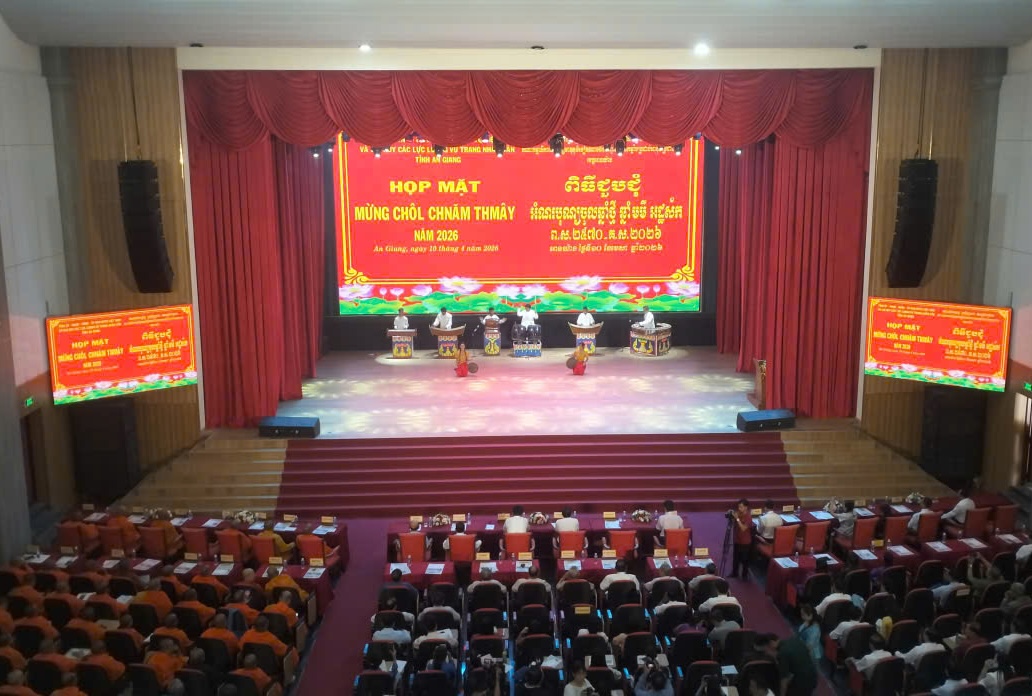 Tết cổ truyền Chôl Chnăm Thmây năm 2026 của đồng bào Khmer diễn ra từ ngày 13-16/4/2026 (nhằm ngày 26-29 tháng 2 âm lịch). Ngày 10/4/2026, tỉnh An Giang tổ chức họp mặt cấp tỉnhmừng Tết Chôl Chnăm Thmây (ảnh).
