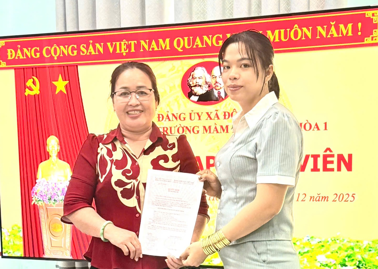 Chi bộ Trường Mầm non Đông Hoà 1, xã Đông Hoà, tổ chức Lễ kết nạp đảng viên.