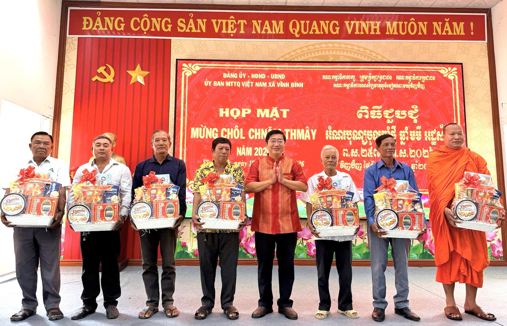 Đồng chí Võ Thanh Xuân, Phó Bí thư Thường trực Đảng uỷ, Chủ tịch Hội đồng nhân dân xã Vĩnh Bình, tặng quà người có uy tín trong đồng bào dân tộc Khmer, nhân dịp Tết cổ truyền Chôl Chnăm Thmây năm 2026.