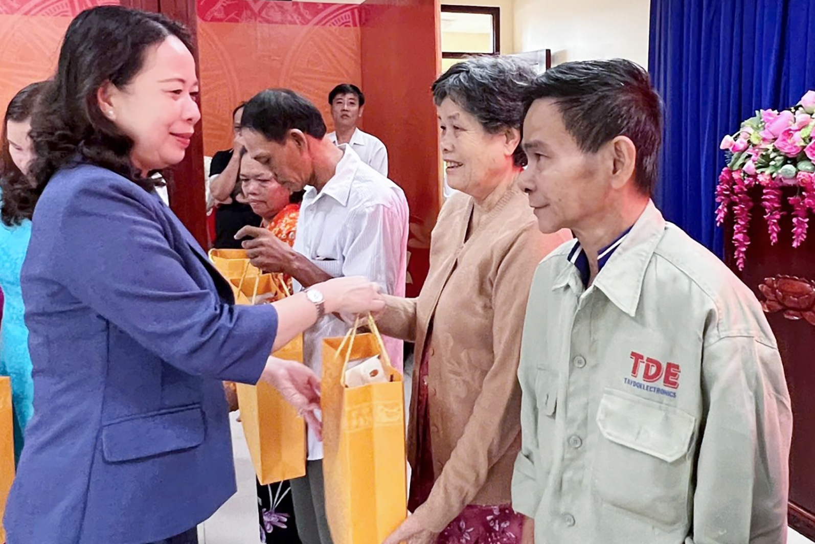 Đồng chí Võ Thị Ánh Xuân, Bí thư Trung ương Đảng, Phó Chủ tịch nước, tặng quà gia đình chính sách, gia đình có hoàn cảnh khó khăn trên địa bàn xã Mỹ Hòa Hưng. Ảnh: AGO