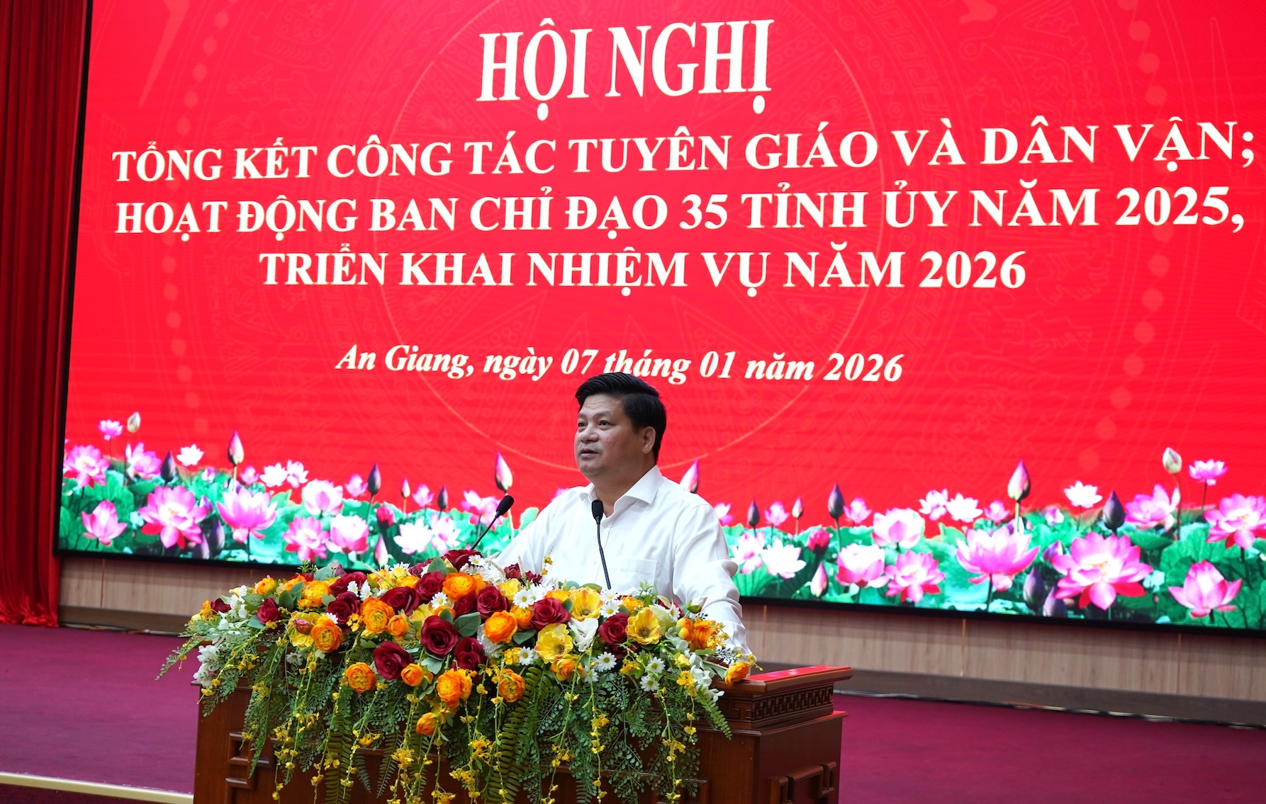 Phát biểu tiếp thu ý kiến chỉ đạo và kết luận tại Hội nghị tổng kết công tác tuyên giáo và dân vận năm 2025 và triển khai phương hướng, nhiệm vụ năm 2026 của Tỉnh ủy An Giang, đồng chí Tống Phước Trường, Ủy viên Ban Thường vụ, Trưởng ban Tuyên giáo và Dân vận Tỉnh ủy, đã nhấn mạnh, cần tiếp tục củng cố, kiện toàn tổ chức bộ máy, cán bộ tuyên giáo và dân vận các cấp theo hướng tinh gọn, hoạt động hiệu quả. Tăng cường công tác đào tạo, bồi dưỡng, nâng cao phẩm chất, bản lĩnh chính trị, năng lực chuyên môn, nghiệp vụ của đội ngũ cán bộ làm công tác tuyên giáo và dân vận đáp ứng tốt yêu cầu nhiệm vụ được giao. Thực hiện ứng dụng mạnh mẽ chuyển đổi số trong ngành tuyên giáo và dân vận.